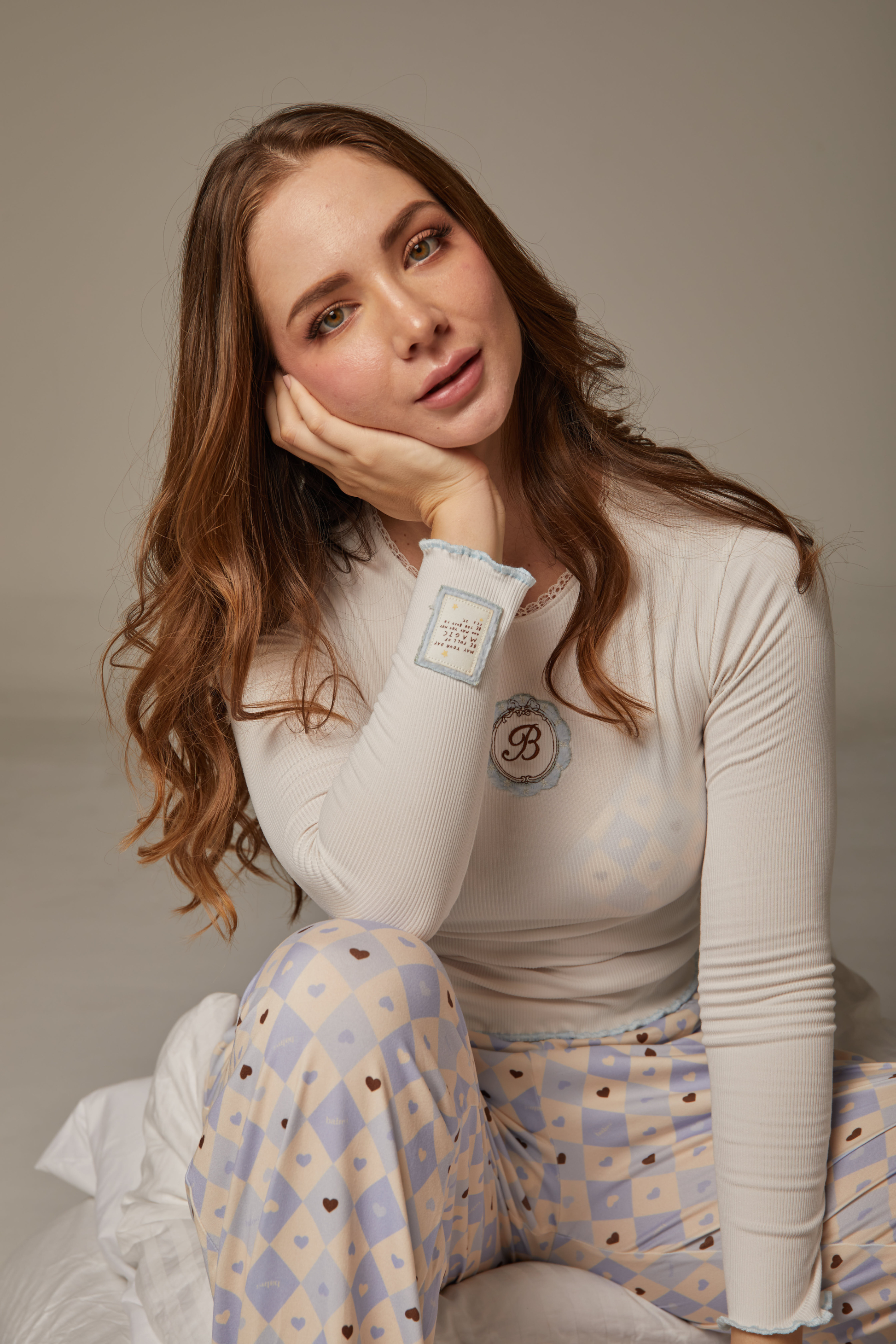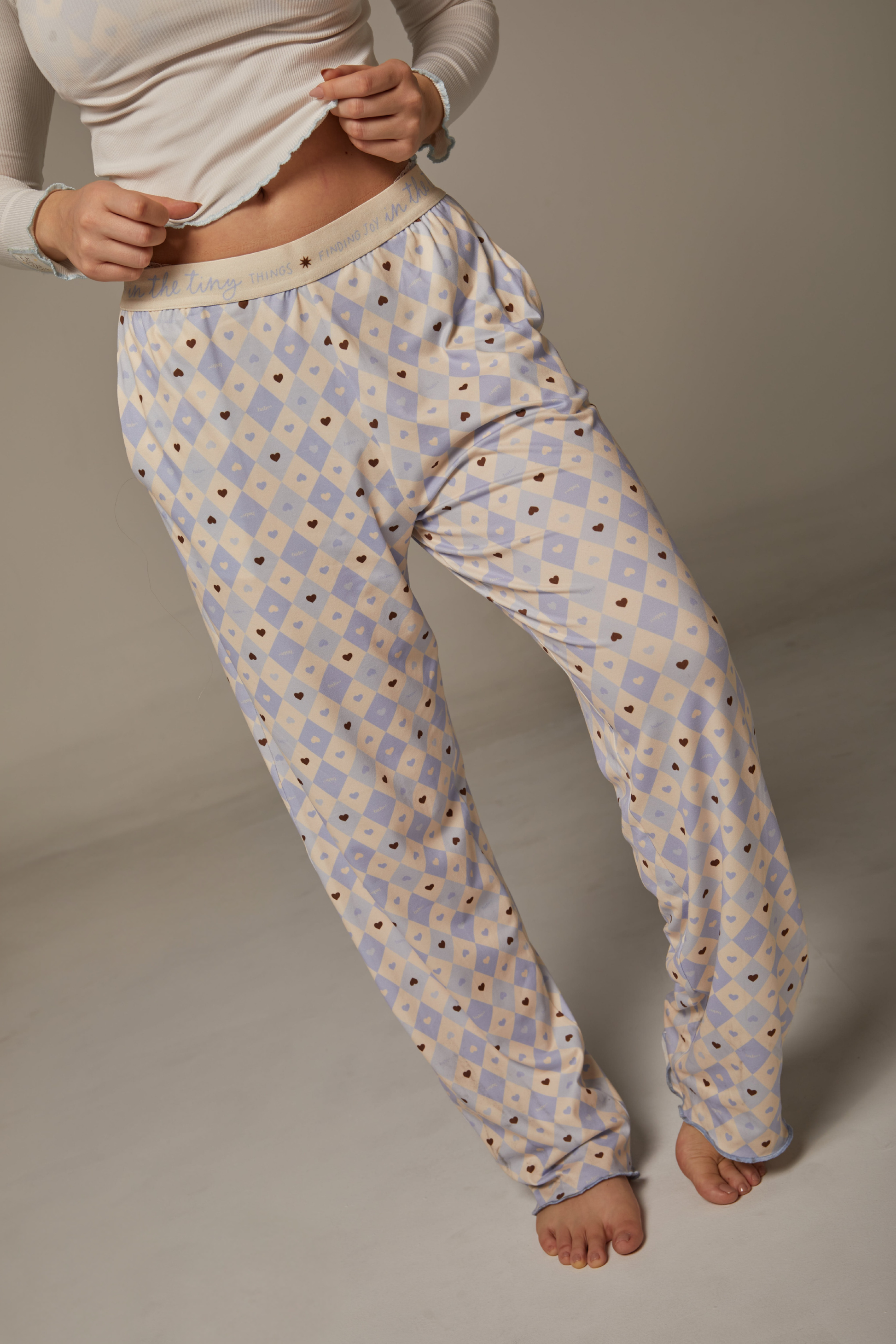 Viene el pantalón con la t-shirt manga larga. El pant es en algodón, obvio tiene bolsillos, elastico contramarcado y dice "Finding Joy in the tiny things". La t-shirt es en el fav de todas COTTON RIB color Ivory, con el cuello elaborado lo más perfecto posible y el bordado mas precioso que vas a ver. No olvidemos la cereza del pastel que es la estampilla de la suerte.