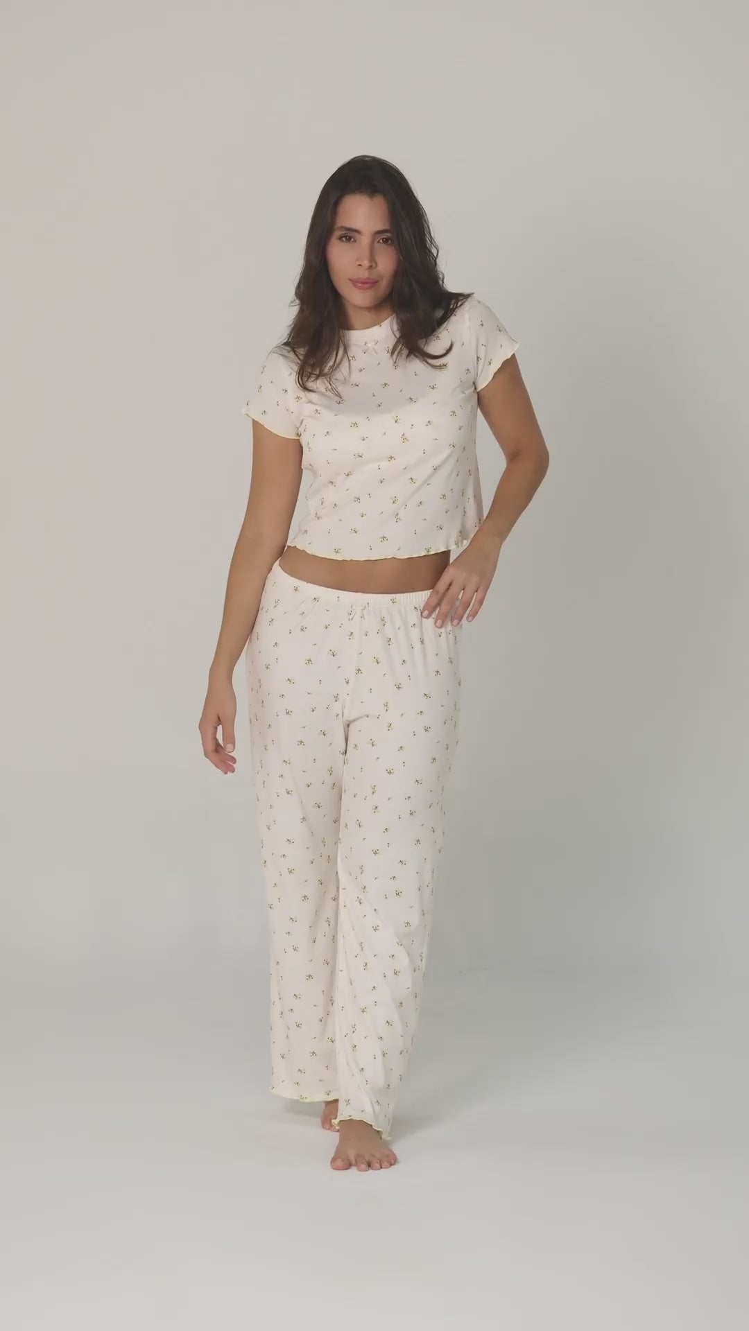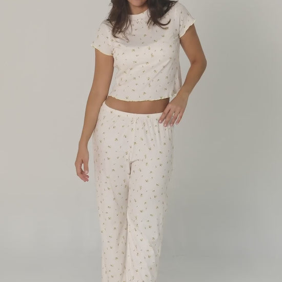 Esta pijama de pantalon con T-shirt combina comodidad y ternura en cada detalle. Su print de mini flores en tonos pastel y la terminación en rouche color amarillo mantequilla le dan ese aire delicado y femenino que hace todo más especial.