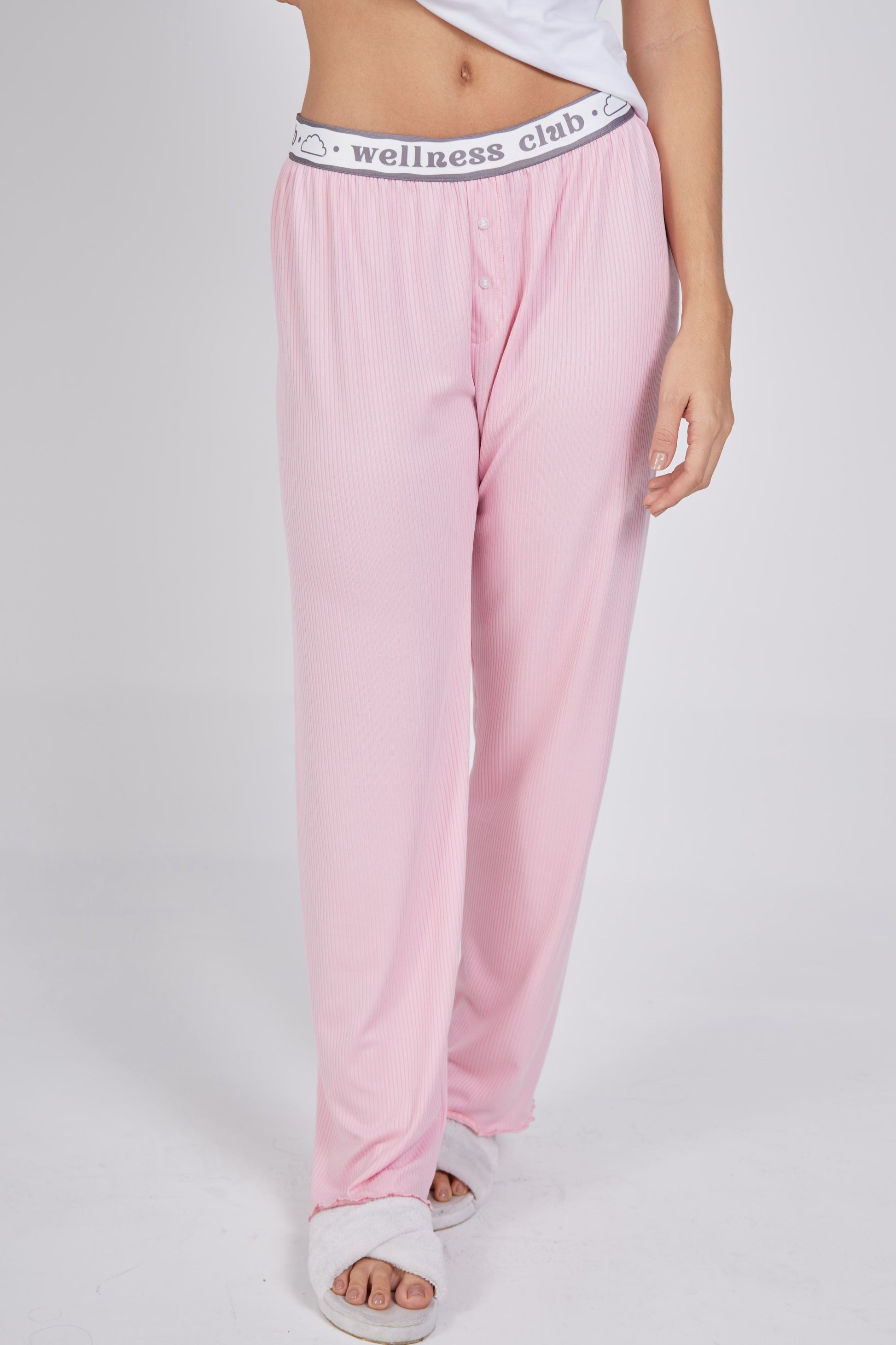 Conjunto de pijama pantalón y camiseta en Algodón RIB, fresca, hermosa y súper cómoda. Elástico contramarcado con wellness club y camiseta estampada